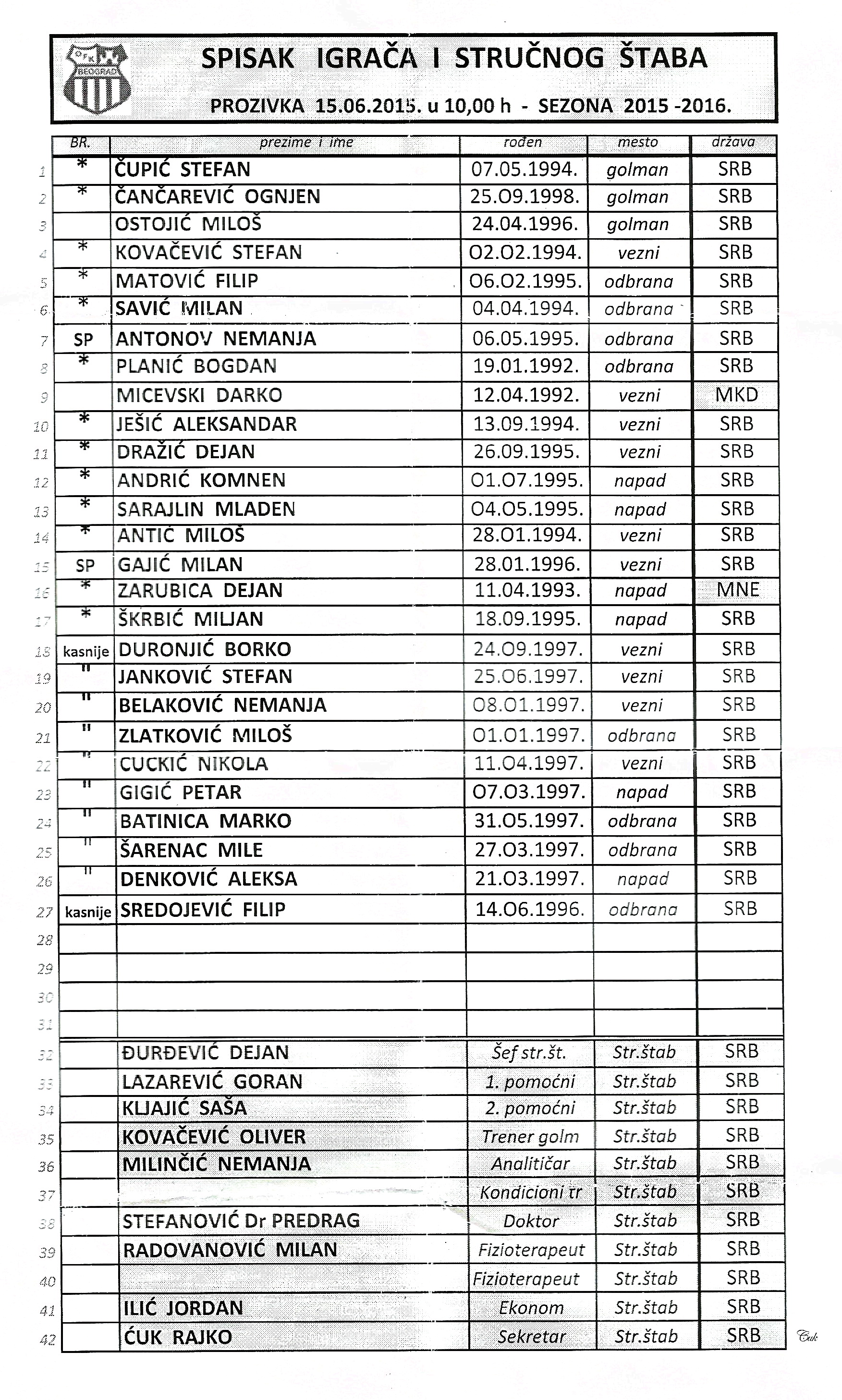 ПРЕЛАЗНИ РОК ЈЕ ПОЧЕО ДАНАС. ДО САДА СУ НАС НАПУСТИЛИ ИВИЦА ЈОВАНОВИЋ (ШВАЈЦАРСКА), ПАЛОЧЕВИЋ (ФК ВОЈВОДИНА), БЕЛИЋ (?), СЕКУЛИЋ (?), АКСЕНТИЈЕВИЋ (AEK?), ДОК ЈЕ СТАТУС МАРКА ЈАНКОВИЋА И САШЕ ЗДЈЕЛАРА ЗА САДА НЕДОУМИЦА ЈЕР СУ ДО САДА КОД НАС ИГРАЛИ КАО ПОЗАМЉЕНИ ИГРАЧИ ИЗ ОЛИМПИЈАКОСА. НА ПРОЗИВЦИ НИСУ БИЛИ НИ АНТОНОВ И ГАЈИЋ КОЈИ СА УСПЕХОМ БРАНЕ БОЈЕ НА СП ЗА МЛАДЕ ДО 20 ГОДИНА КОЈЕ СЕ ОДРЖАВА НА НОВОМ ЗЕЛАНДУ. ФАЛИЛО ЈЕ И НЕКОЛИКО МЛАДИХ ИГРАЧА КОЈИ СУ ДО СКОРА ИГРАЛИ ОМЛАДИНСКУ ЛИГУ.